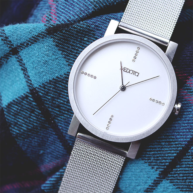 極簡輕薄系列–奢華款潔淨錶盤搭配閃爍施華洛世奇晶鑽製作的4時位設計,在任何場合都能成為焦點,展現出現代男女追求多變的有趣生活態度,是款不容錯過的亮眼錶款,全錶款採用霧面絲紋不銹鋼材質,並採用抗磨損藍寶石水晶玻璃及瑞士機芯。無論是情侶或是閨蜜都適合的對表,另可搭配尼龍錶帶。
