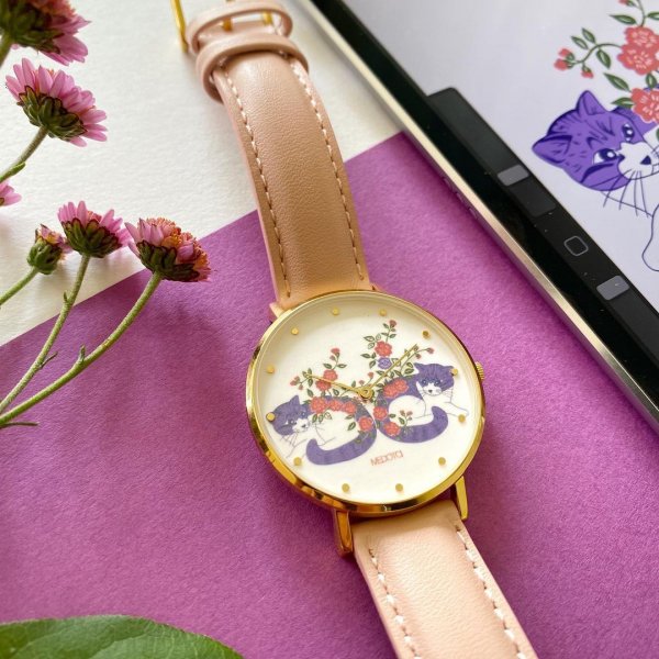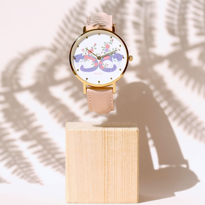 以經典小錶面呈現,搭配上插畫家細緻可愛的貓咪圖案,整體以柔和色系為主,每日戴上他,都將會有個開心完美的一天