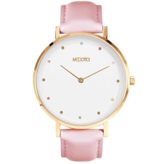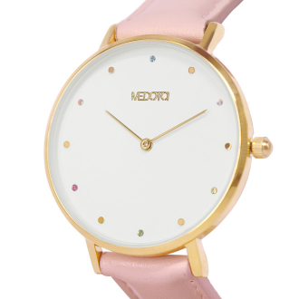 RAINBOW系列採用進口捷克鑽石,以小巧可愛的圓形點綴於潔白的錶面上,搭配上粉色真皮錶帶,散發出濃烈的少女感