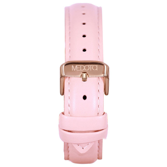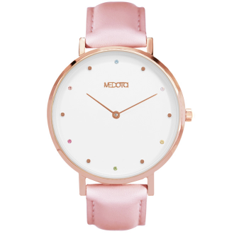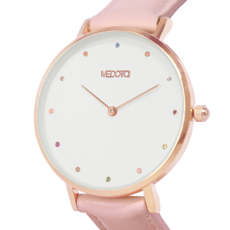 RAINBOW系列採用進口捷克鑽石,以小巧可愛的圓形點綴於潔白的錶面  上,搭配上粉色真皮錶帶,散發出濃烈的少女感