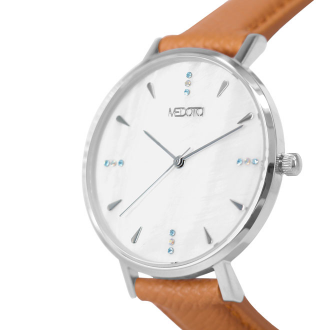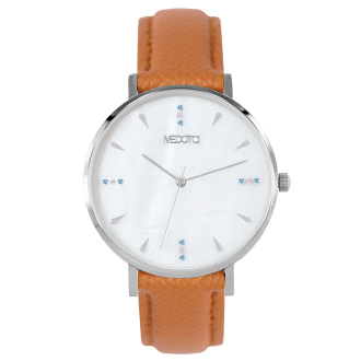 將柔和的貝殼錶面搭配上耀眼動人的鑽石,在與法國進口真皮錶帶做結合,使整體錶款增添幾分個性感詮釋出一位耀眼動人女性擁有勇敢外表和溫柔的內心的特質