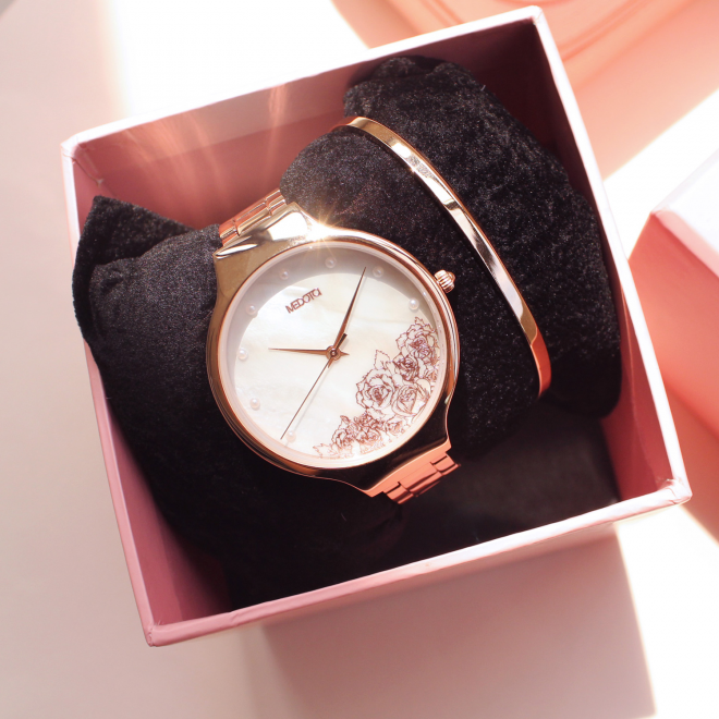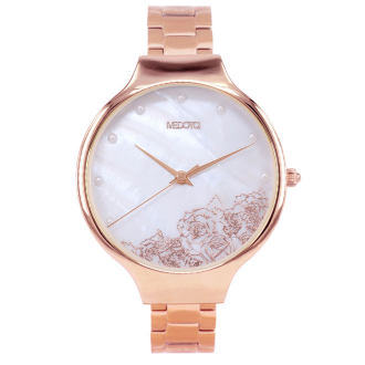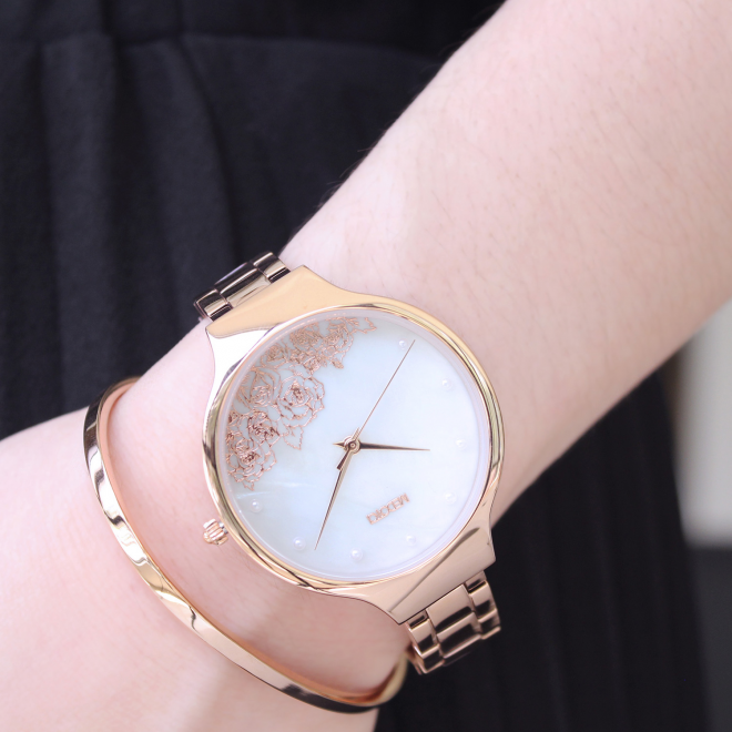 精緻的玫瑰雕花、純白的珍珠時位、浪漫的貝殼錶面
