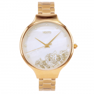 精緻的玫瑰雕花、純白的珍珠時位、浪漫的貝殼錶面