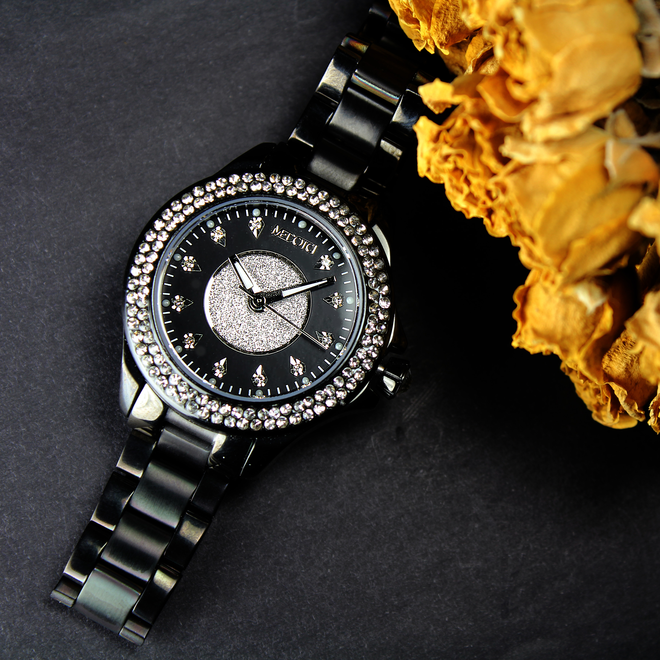 Farfalla.D 法蝶系列運用少見的閃粉做為核心,搭配銀的特殊切割作為小時辨識,鑲上精細工藝加工後的寶石,營造華麗且脫俗的氣質,如同皇室般高尚典雅,受人尊敬,以較寬的時分針來加強時間的辨識度,傳達您的正直爽朗,配上夜光,在夜晚也能夠清晰的讀出時刻。