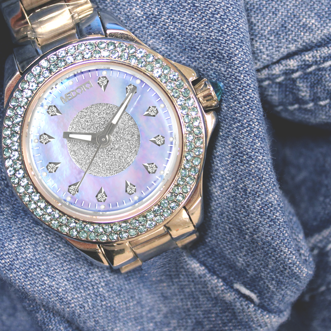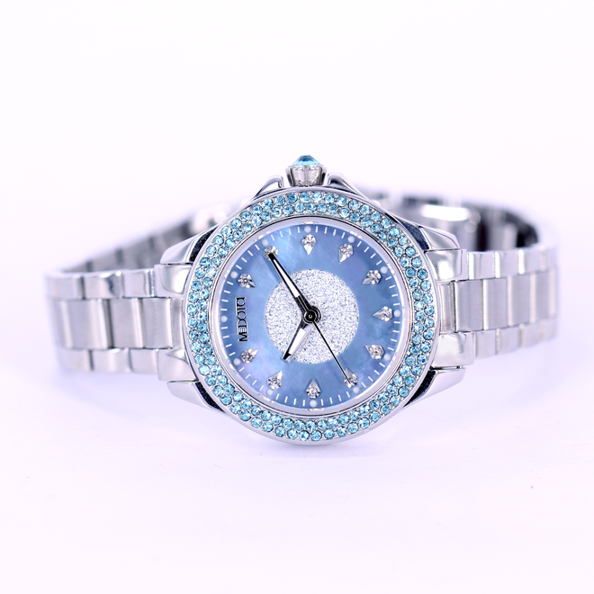 Farfalla.D 法蝶系列運用少見的閃粉做為核心,搭配銀的特殊切割作為小時辨識,鑲上精細工藝加工後的寶石,營造華麗且脫俗的氣質,如同皇室般高尚典雅,受人尊敬,以較寬的時分針來加強時間的辨識度,傳達您的正直爽朗,配上夜光,在夜晚也能夠清晰的讀出時刻。