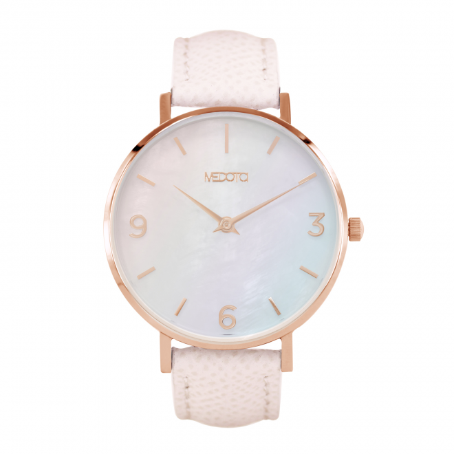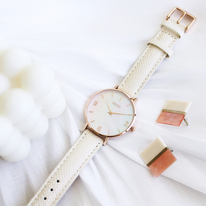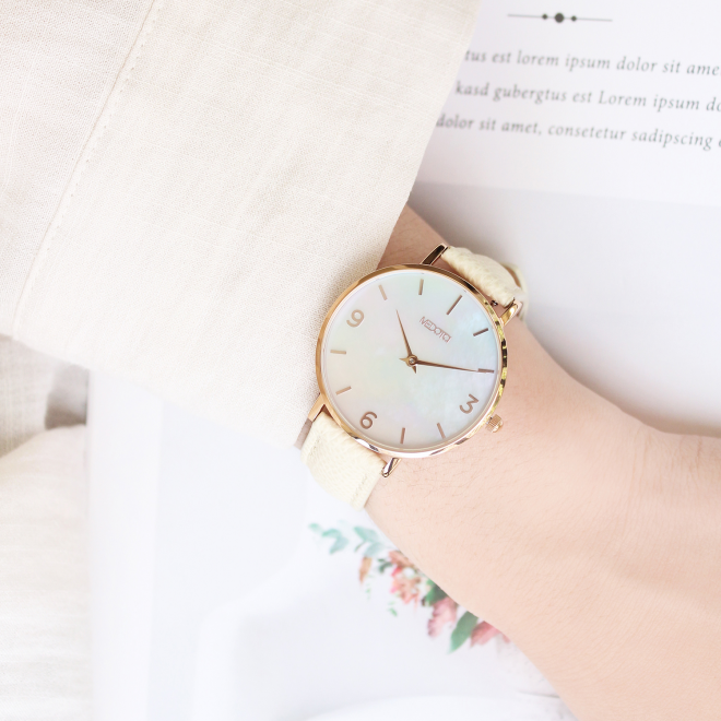 珍珠母貝具有獨特天然的紋路,透過精細的處理製成錶面,使配戴時,隨著不同角度的變化,