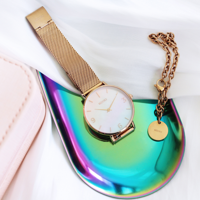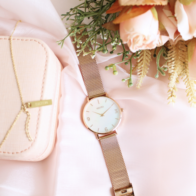 珍珠母貝具有獨特天然的紋路,透過精細的處理製成錶面,使配戴時,隨著不同角度的變化,