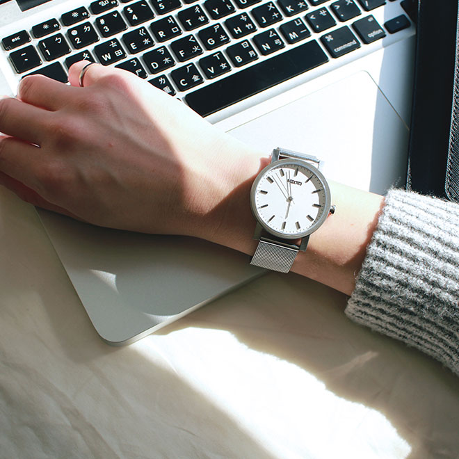 極簡輕薄系列–倒影款獨創0.8mm厚度斜面12時位設計的錶款,透過細緻工藝製作成的指針及不銹鋼錶身搭配,傳遞出濃濃復古時尚感。錶款錶面採用抗磨損藍寶石水晶玻璃而機芯則選用瑞士製,是款男女皆可配戴的情侶錶,另可搭配尼龍錶帶。